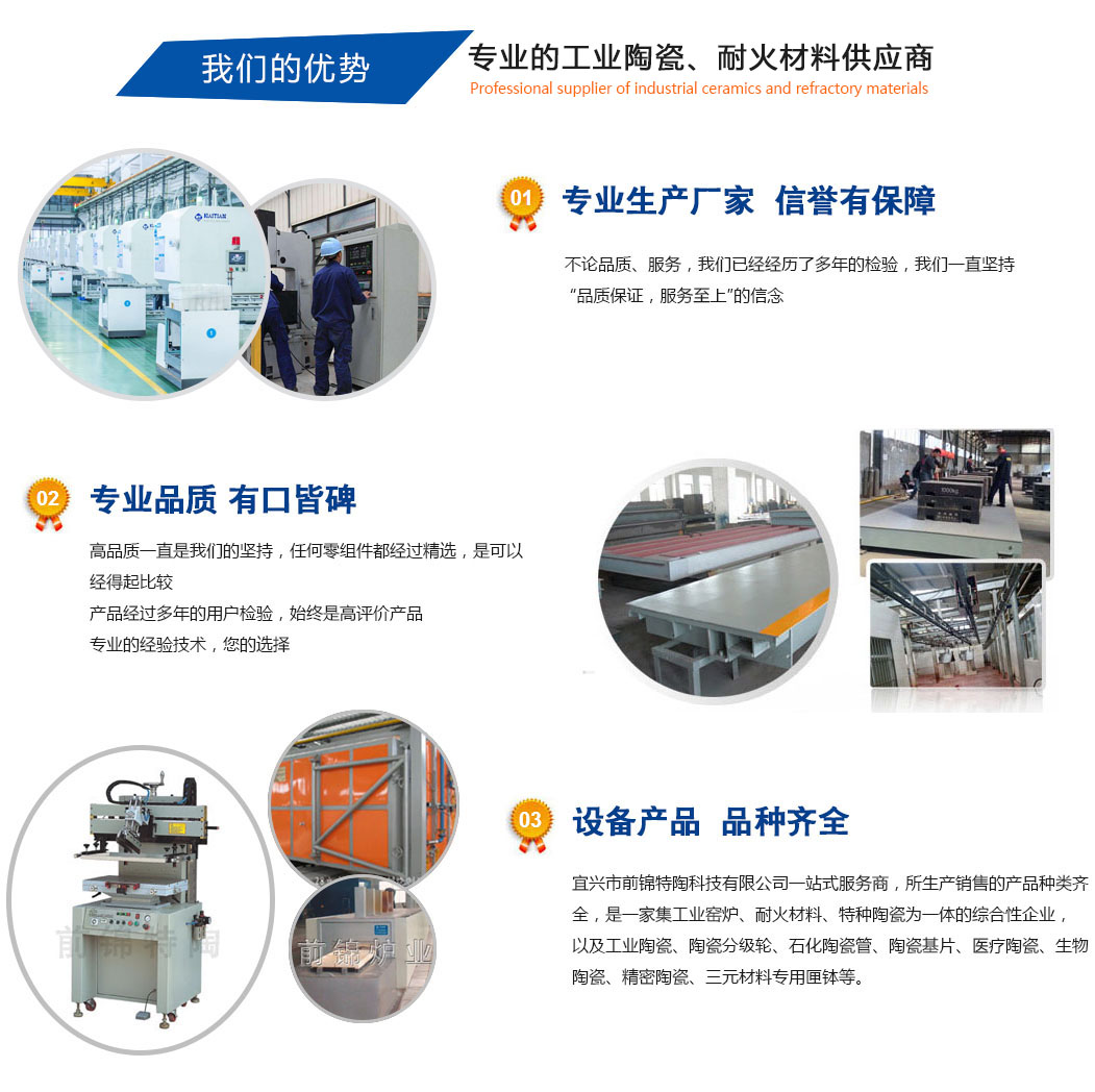 宜興市前錦特陶有限公司作為成員企業(yè)之一,公司主要生產(chǎn)工業(yè)陶瓷、窯具、匣缽、窯爐內(nèi)襯系列。工業(yè)陶瓷以生產(chǎn)氧化鋯陶瓷、氧化鋁陶瓷、碳化硅陶瓷、氮化硅陶瓷等先進陶瓷為主;碳化硅制品有碳化硅異形件、三明治板、爐管等系列;耐火高溫窯具為剛玉爐管、剛玉莫來石制品、剛玉推板等產(chǎn)品;以及燒結(jié)墊板、氧化鋁空心球制品、sic板、石墨坩堝、堇青石復(fù)合莫來石板移進板、鋯粉、氮化硅陶瓷環(huán)、陶瓷棒、石化陶瓷管、陶瓷基片、磨介、分級輪和氮化硅球閥、熱電偶保護管、升液管等...